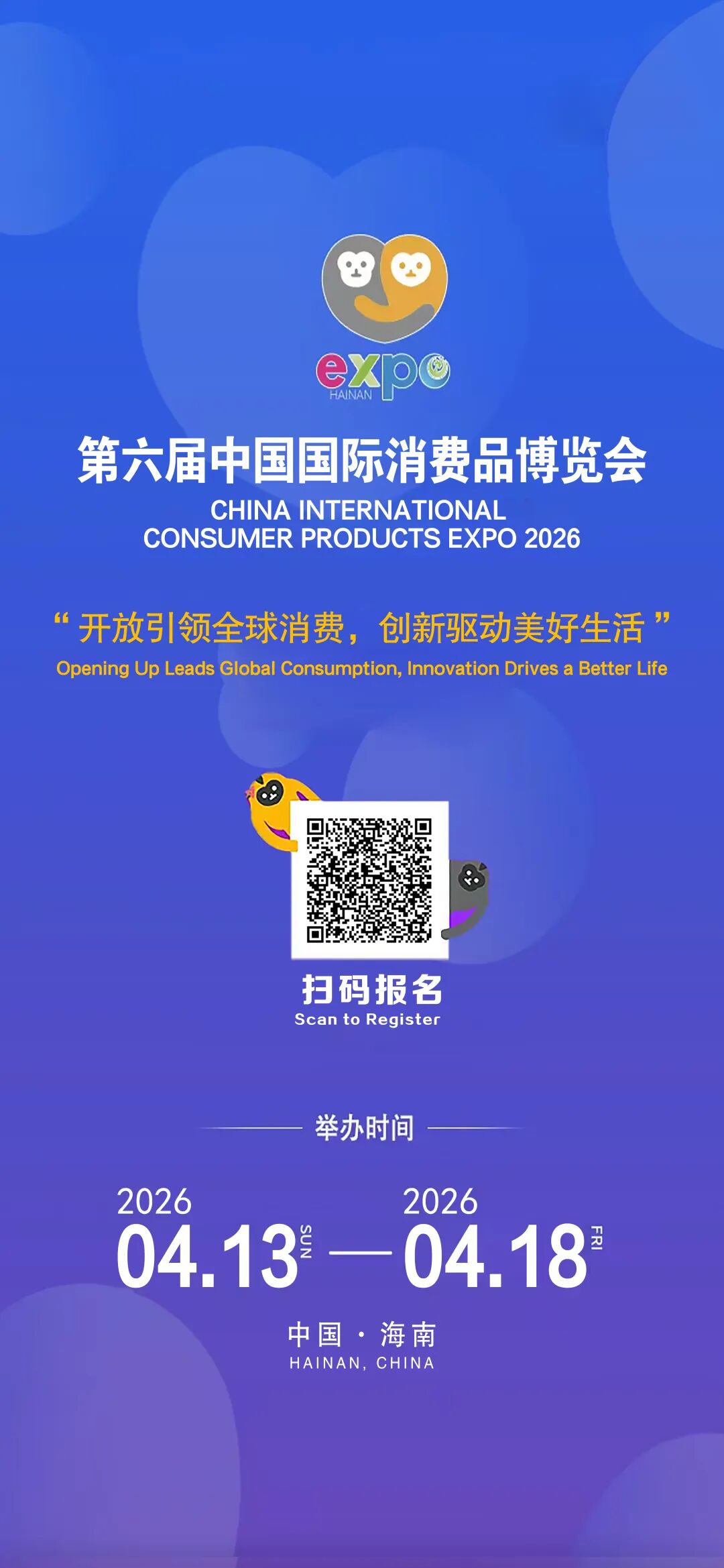 第六届中国国际消费品博览会将于2026 年 4 月 13 日 —18 日在海南海口举办。为助力协会会员企业拓展市场、精准对接优质资源,欢迎各单位积极报名参展参会。